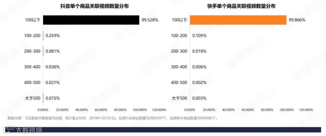 2019年单个商品关联视频数主要分布在100以下,抖音占99.528%,快手占99.866%,且快手单个商品关联视频数低于10的占比达94.95%。抖音、快手平台商业化发展时间较短,短视频内容电商尚未成熟,对抖音、快手电商带货不了解,不知道怎么开展,因此绝大多数商品品类在抖音、快手的电商带货处于试水阶段。