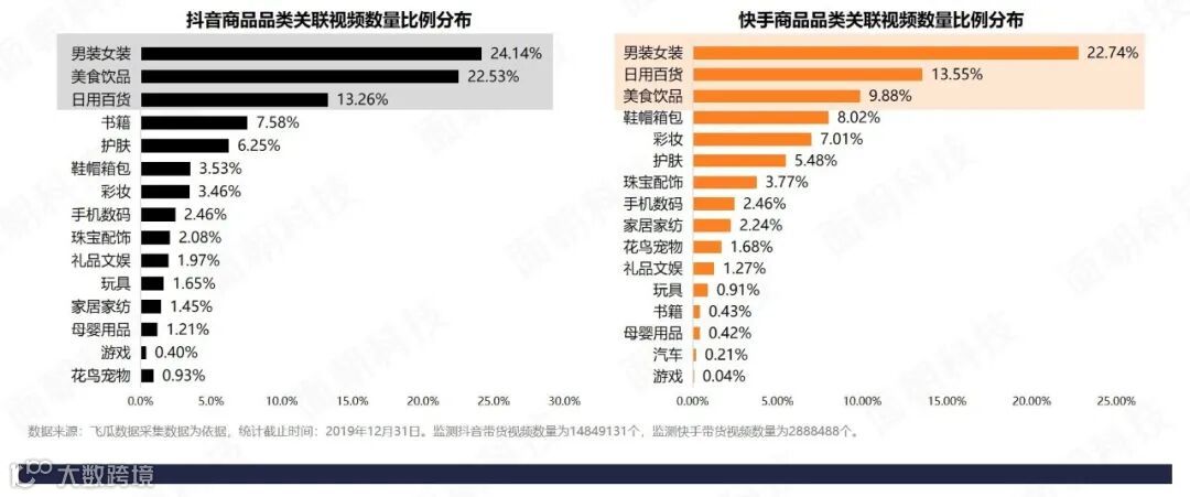 ●美食饮品、书籍、护肤等商品品类抖音带货视频数量占比高于快手