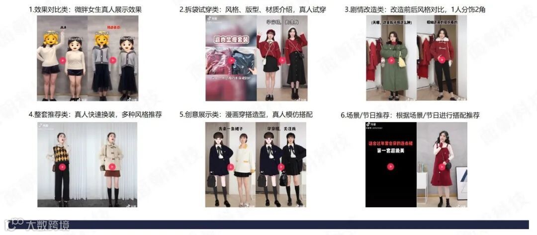MG小象穿搭类短视频内容类型均以漂亮小姐姐真人出境,穿搭内容类型主要分为以下几类,并且在视频文字描述中添加固定话术,如“留下身高体重,我来帮你搭配”,提高用户评论互动积极性和购买兴趣,促进购买转化。