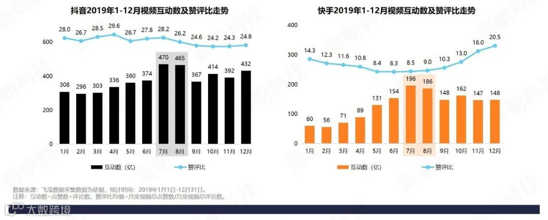 2019年抖音、快手平台视频互动数均呈现上升趋势,且在暑期7、8月份互动数达到峰值。抖音平台月均赞评比数值较为稳定,主要分布在24-30的区间,而快手平台月均赞评比数值存在较大波动,年中较低,年初、年末较高。