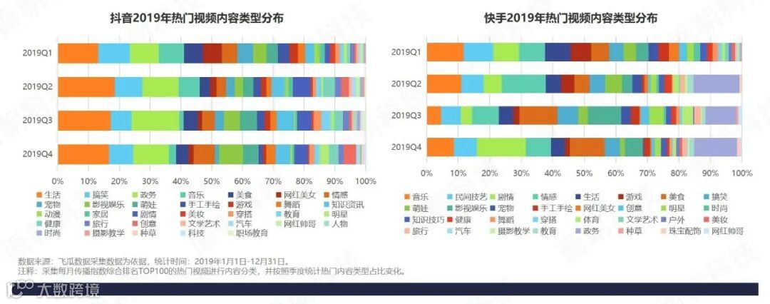 由于平台分发机制的差异,两个平台所呈现的内容也有所不同。抖音平台热门内容集中度较高,内容更加精致,快手平台热门内容集中度较低,内容更加原生化。