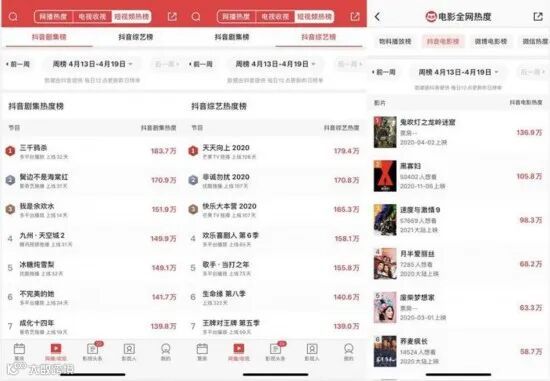 4月18日,猫眼专业版App发布更新版本,上线数据服务新功能——抖音热度榜。目前,该榜单包含抖音剧集榜、抖音综艺榜、抖音电影榜,是由影视项目在抖音平台的官方账号影响力、影片讨论度、话题指数和搜索指数加和而成的热度值排名。