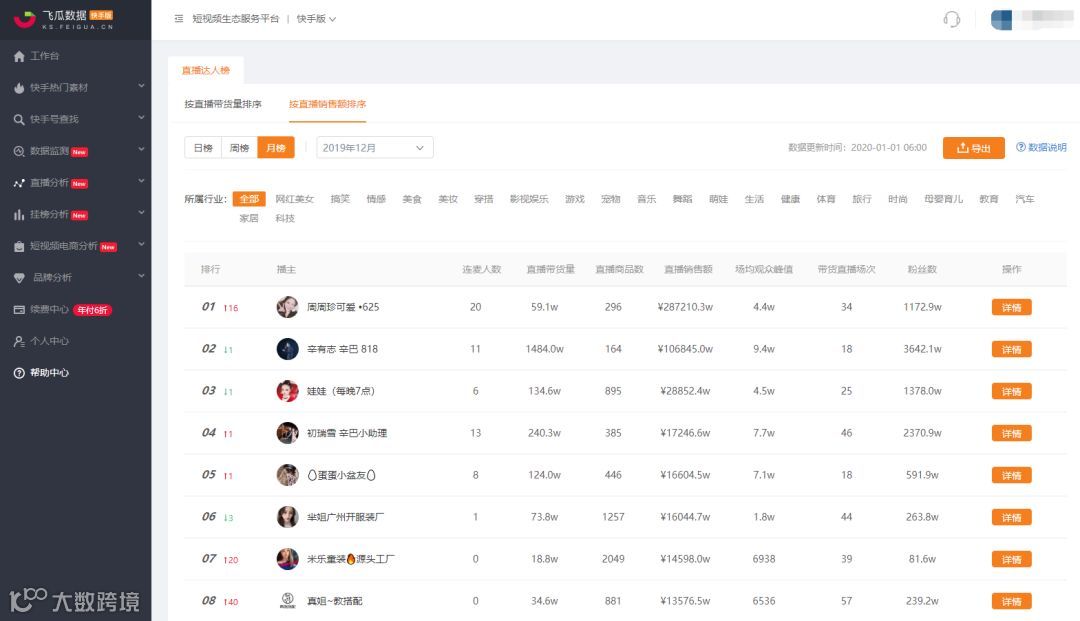 飞瓜数据快手版,为快手量身打造的数据分析产品。致力于帮助快手从业者更好地运营账号,创作内容。利用大数据的力量,让你直观了解各大快手主播的带货能力、当下爆款畅销商品和挂榜连麦的效果。