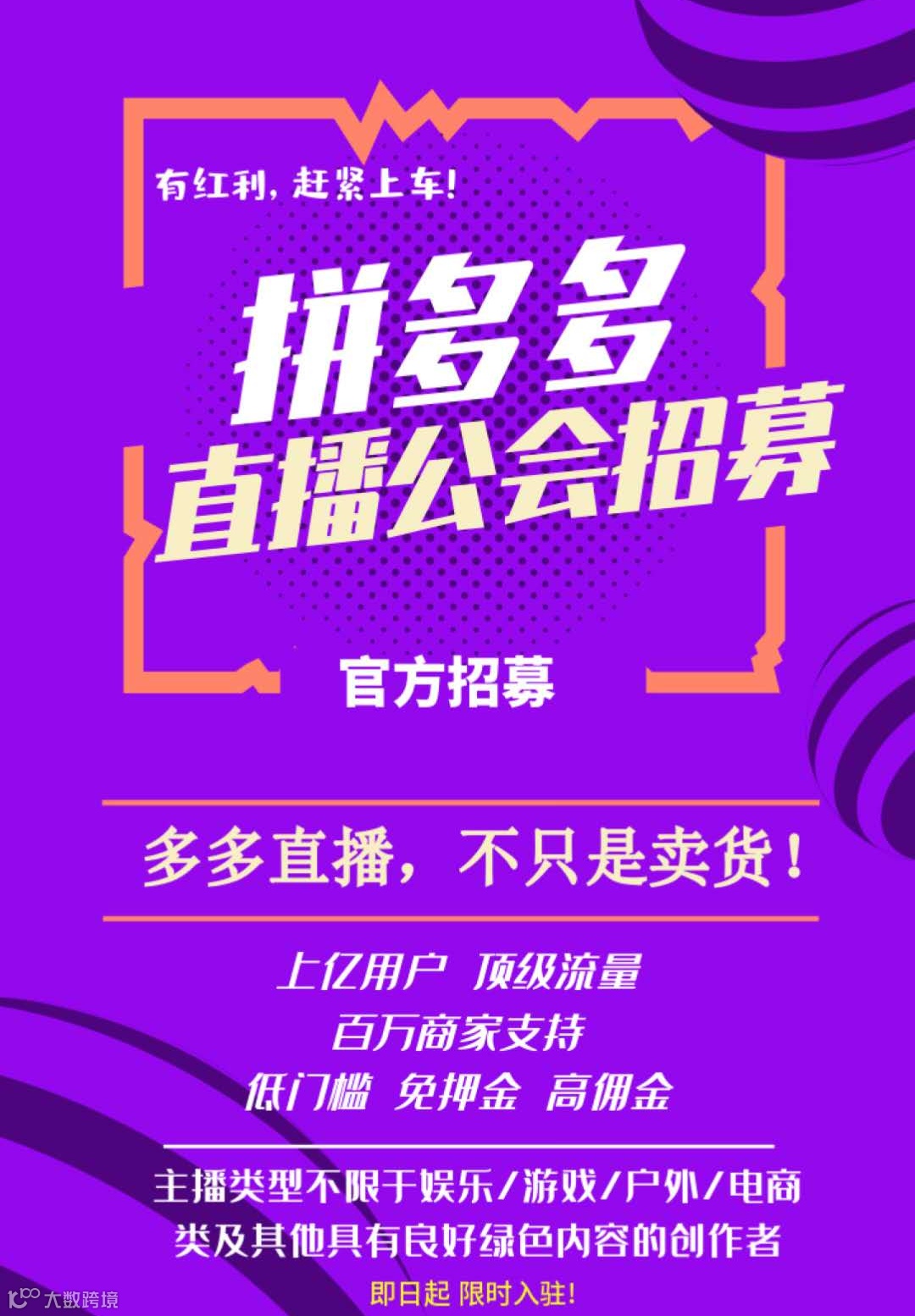 4月23日,拼多多对外招募秀场直播公会,主播不限娱乐、游戏、户外等类型。目前拼多多已与多家MCN就生产娱乐内容达成合作。