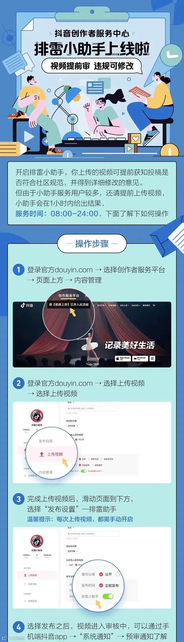 近期,抖音上线“排雷小助手”,用户开启后,可提前获知投稿视频是否符合社区规范,并获得详细修改的意见。