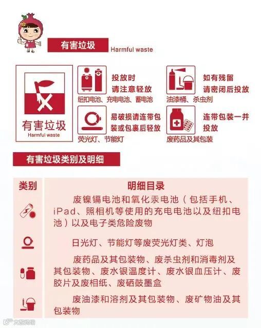 ●除一次性电池外的二次电池(俗称充电电池,包括镍镉、镍氢、锂电池与铅酸蓄电池)、纽扣电池,这些电池中均含有重金属,属于有害垃圾,要投放到有害垃圾桶中,个人不得随意丢弃。