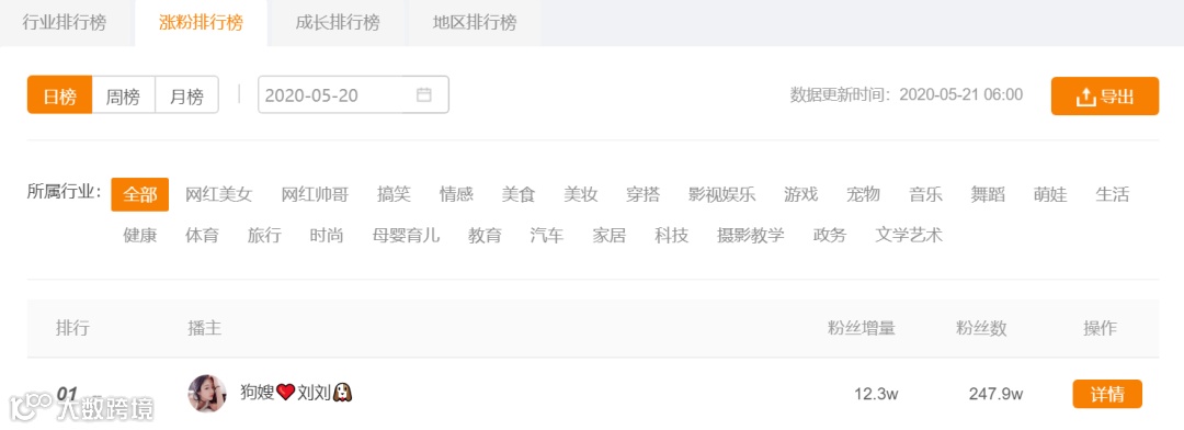 登飞瓜数据快手版涨粉日榜首位