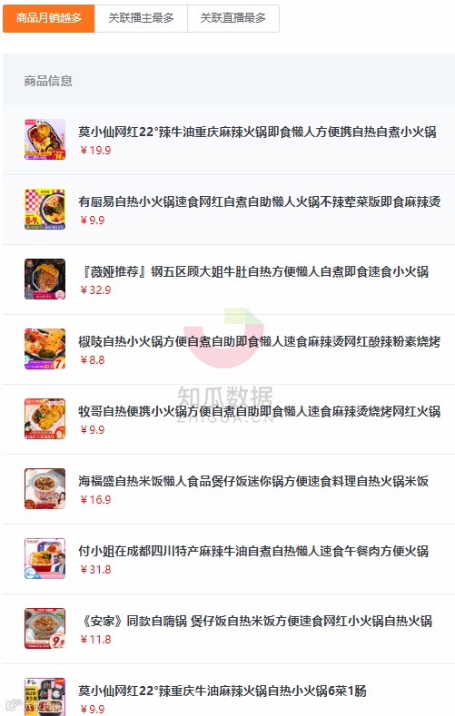 我们在知瓜数据中可以看到,上直播进行营销的自热商品已经达到了几十种品牌。其中,月销第一的是莫小仙的【莫小仙网红22°辣牛油重庆麻辣火锅即食懒人方便携自热自煮小火锅】,19.9元月销量达72.45万。