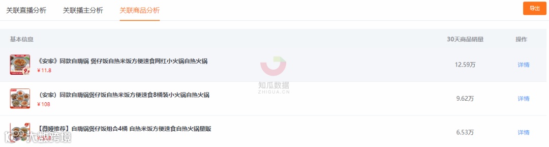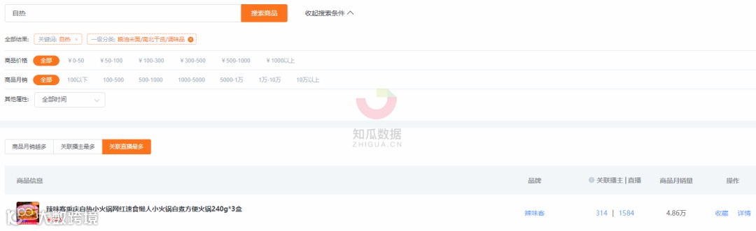 但从关联直播和播主最多的产品来看,TOP1则是辣客味的【辣味客重庆自热小火锅网红速食懒人小火锅自煮方便火锅240g*3盒】,月销量为4.86万,30天关联播主达到314人。