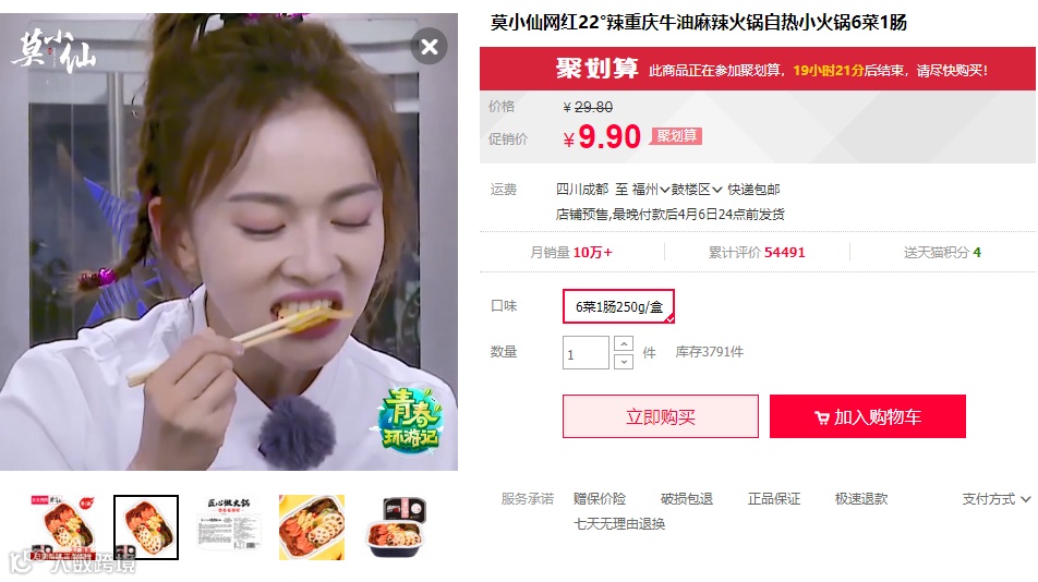与自嗨锅类似的莫小仙也植入了《青春环游记》、《我最爱的女人们》、《女儿们的恋爱2》等综艺节目,进入旗舰店的商品详情中也可以看到植入片段。