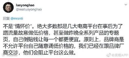 罗永浩表示,绝大多数都是几大电商平台在事后为了蹭流量故意做低价格,甚至做4月1日全系列产品的专题页,自己倒贴钱让每一个都便宜。原则上品牌商不允许平台自己随意调低价格,他们已经在跟品牌厂商交涉。