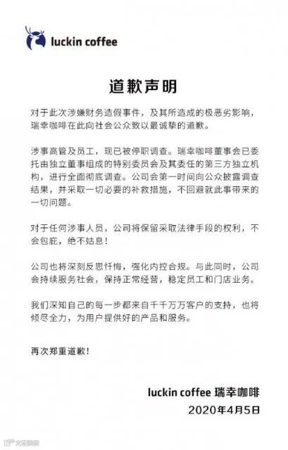 瑞幸咖啡官微发布致歉声明:涉事高管及员工已被停职调查