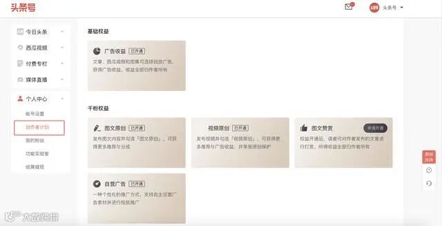 2020年6月2日,今日头条将统一管理作品、提现收益、管理权益的入口「创作中心」和向作者明示平台规则(包括作者权益和信用分规则)的「创作者计划」向所有创作者正式开放。此前,「创作中心」和「创作者计划」已向粉丝数(今日头条、西瓜视频粉丝总数)不低于一千的作者开放内测。