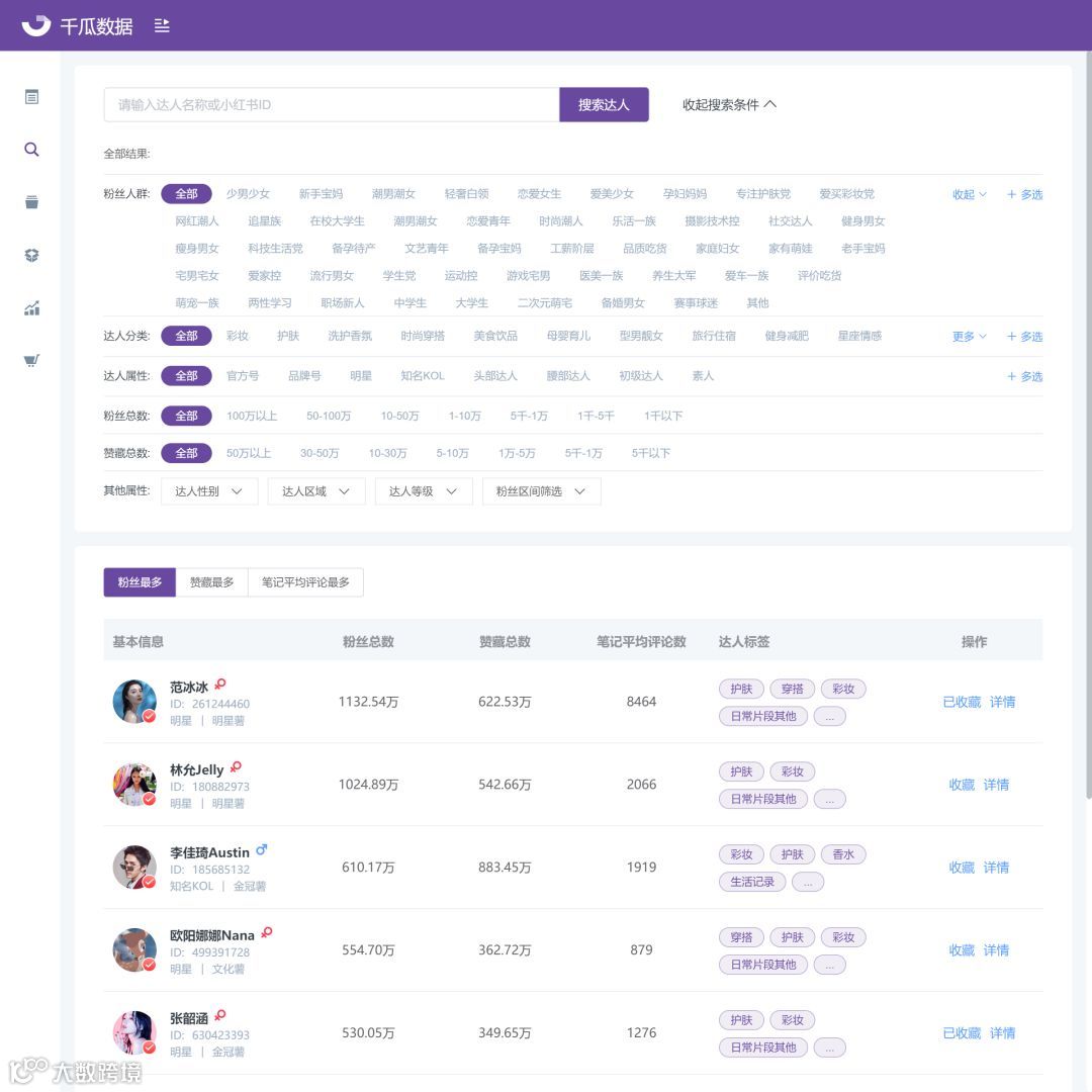 明星、KOL、达人、优质素人、品牌合作人、内容号、营销号 ,多维度定向查询;