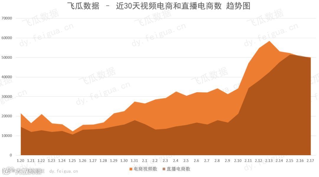 我们通过飞瓜数据选取近30天每日新增视频电商和直播电商数的趋势图,发现最近抖音的调整,在这周的抖音带货中,直播电商和视频电商的数量已经趋同,可见现在直播已经成为抖音变现的重要流量渠道之一。