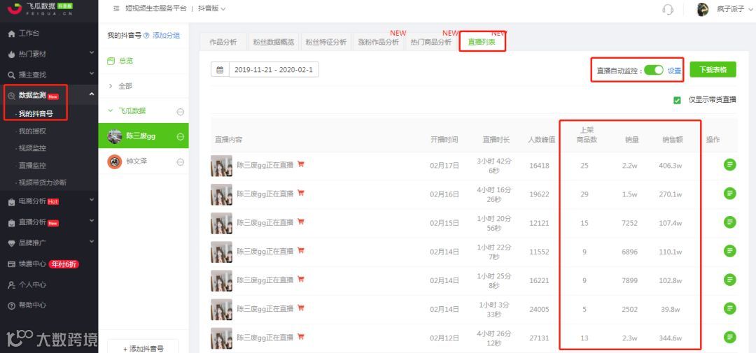 同时,在我们找到优质的直播带货播主,想要自动监控「陈三废gg」的直播带货记录,只需要将账号加入【我的抖音号】,在【直播列表】中,可以设置直播自动监控。