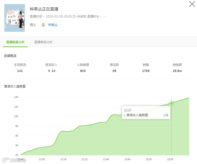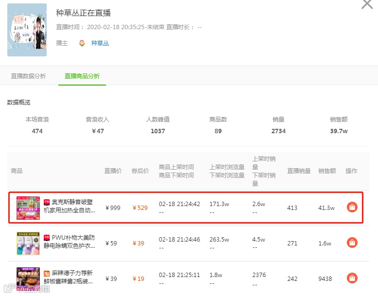 我们可以看到「种草丛」从8点半开始直播,直播间的最高在线人数是1037人,在2个小时的直播时间内,销售额达到了39.7万,那么究竟他的直播间在卖什么商品呢?