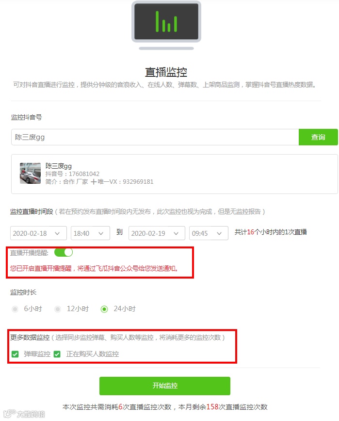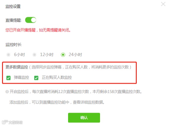 开启【直播自动监控】后,系统会自动对该播主直播,可以设置直播提醒,通过飞瓜数据公众号在手机端推送直播提醒,同时也手动选同步监控弹幕数、正在购买人数,更精准判断直播间的带货影响力。