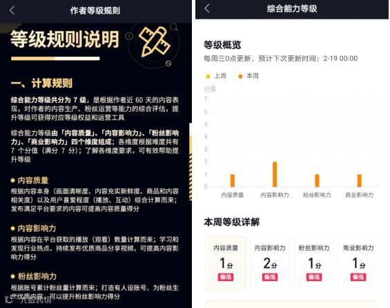 个人等级每周三更新一次,主要根据内容质量、内容影响力、粉丝影响力和商业影响力4个方面进行评分。