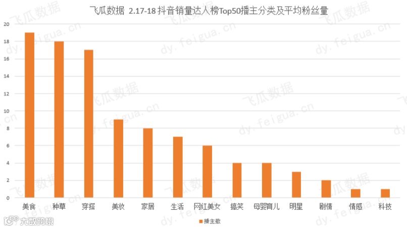 飞瓜数据整理了17-18号期间,达人榜Top50的82名播主数据,发现上榜播主多以美食、种草、穿搭为主,其中两天都上榜的播主大多有鲜明的人设,比如「韩国媳妇大璐璐」「c小旭呐🍒🌸」。