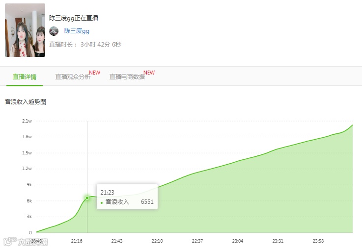 我们通过“正在购买人数趋势图”就可以发现在23:25左右,达到了当场直播的购买人数峰值,那么我们就可以去定位那时候「陈三废gg」的主推商品,学习直播带货的策略。