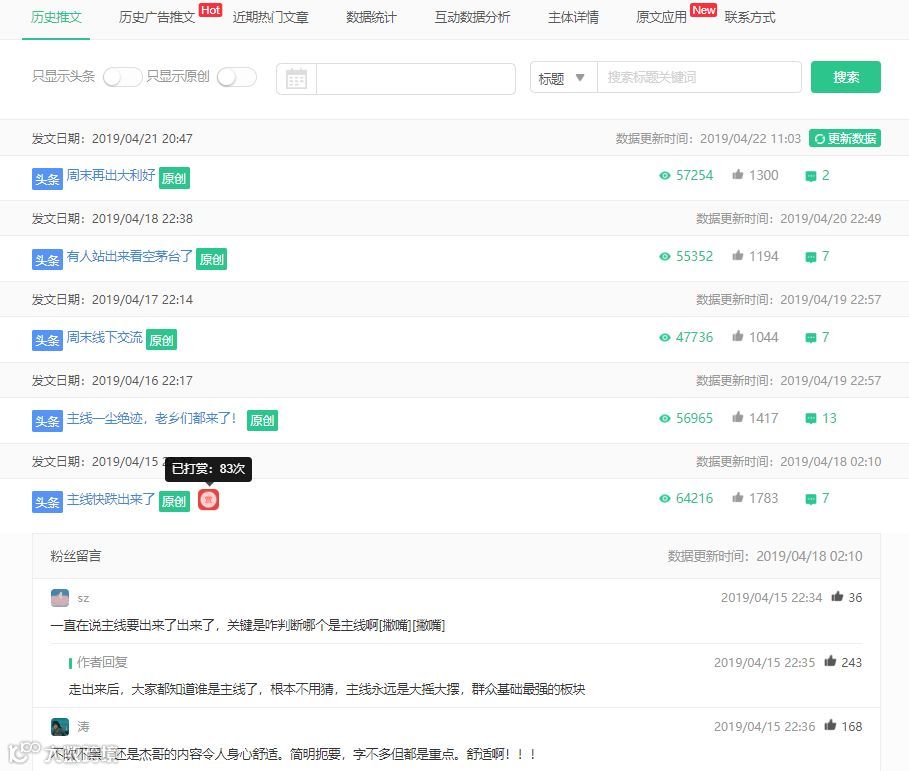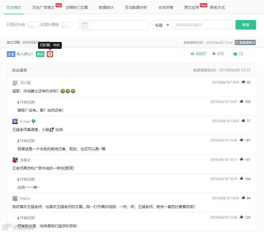 “王猛”上周发文 3 篇,共揽获阅读总量 15w+ 。从18号发文的留言中可以看出号主与粉丝间的互动还是不错的,回复点赞也相对更高。