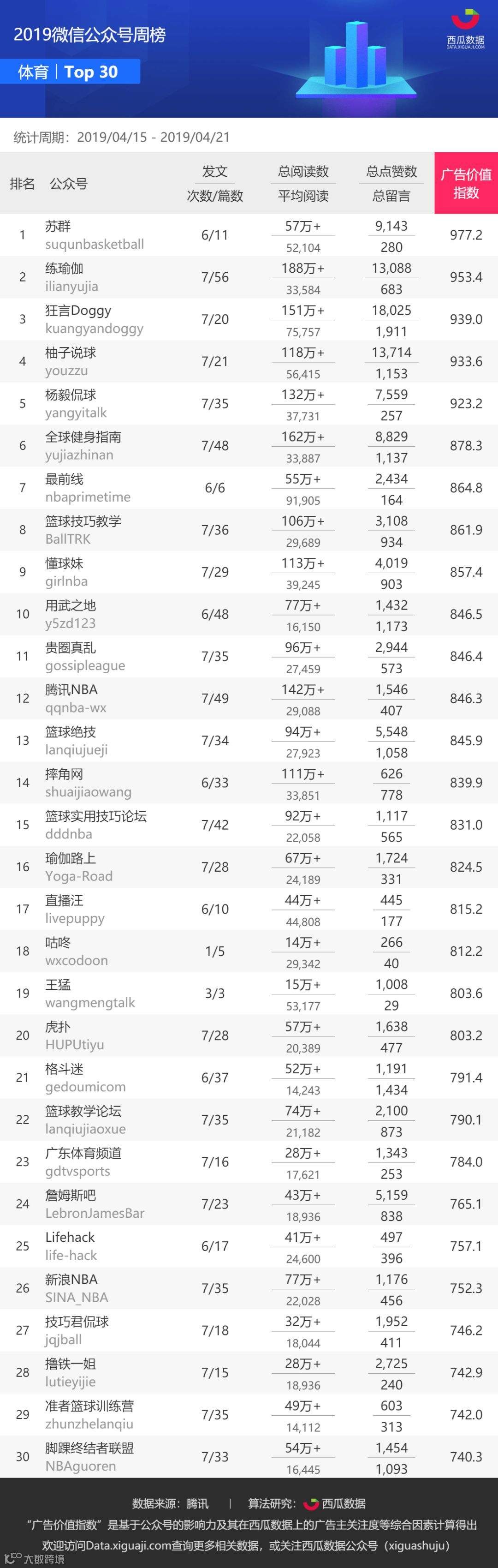 “苏群”上周发文 6 次共 11 篇,共揽获 57w+ 的阅读,以广告价值指数 977.2 位居榜首。