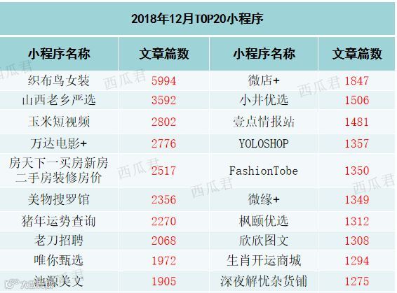 考虑到数量巨多,数量庞杂,西瓜只从数据库中抓取了2018年12月最活跃的TOP20小程序名单,并统计了这一个月内发布的包含了该小程序的文章数。