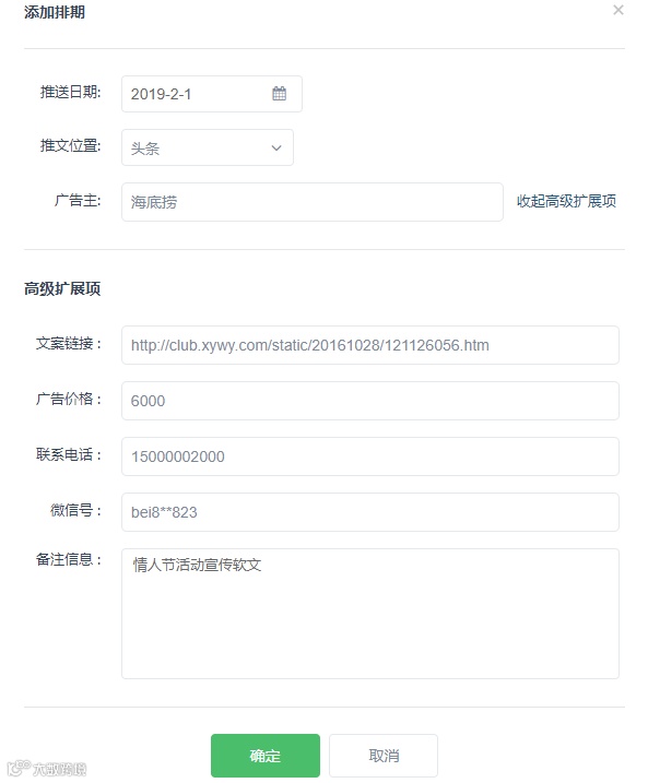 点击“添加排期”,可以填写推送时间、位置、以及广告主信息,还可以把客户指定的文案链接、以及要求备注进去,方便团队其他伙伴查看。