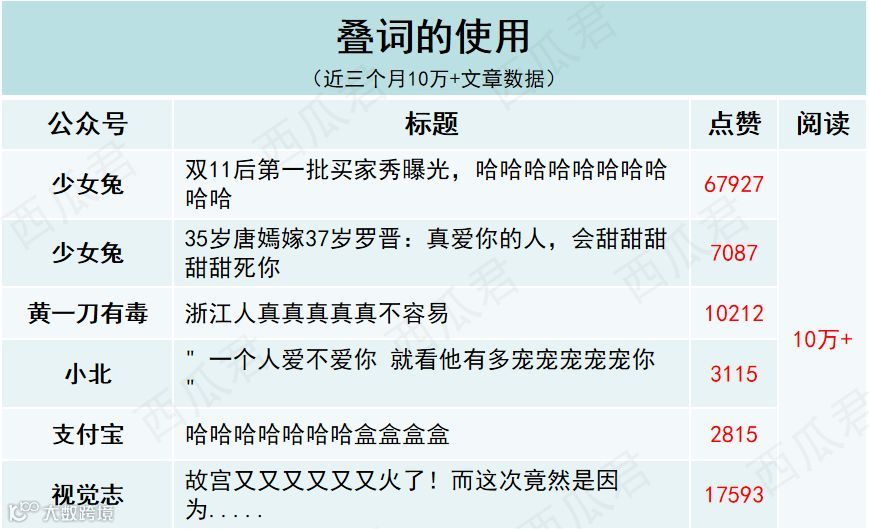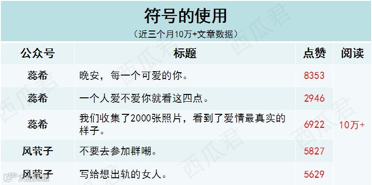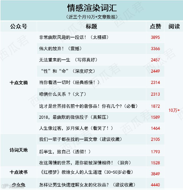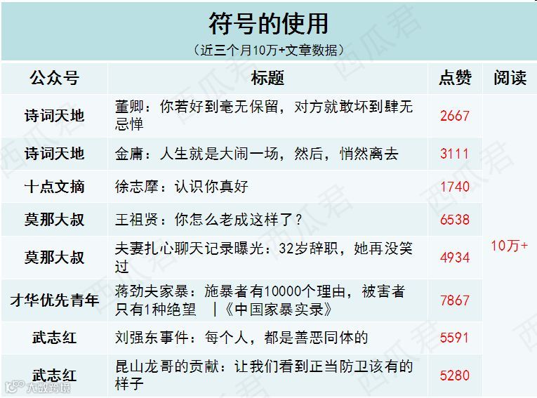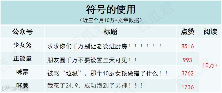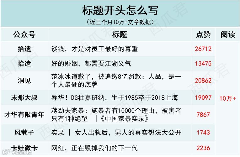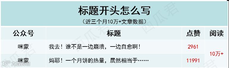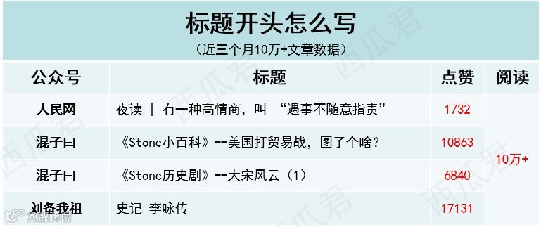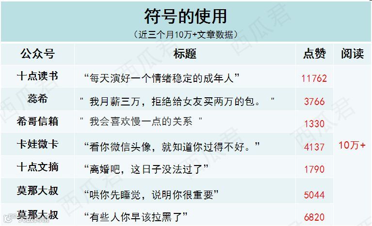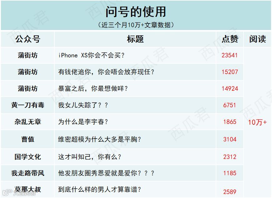 西瓜筛选了“咪蒙、十点读书、视觉志、有书、蒲街坊”等大号近三个月10万+文章数据,总结了一些实用的标题套路,想给你提供一些取标题的思路!