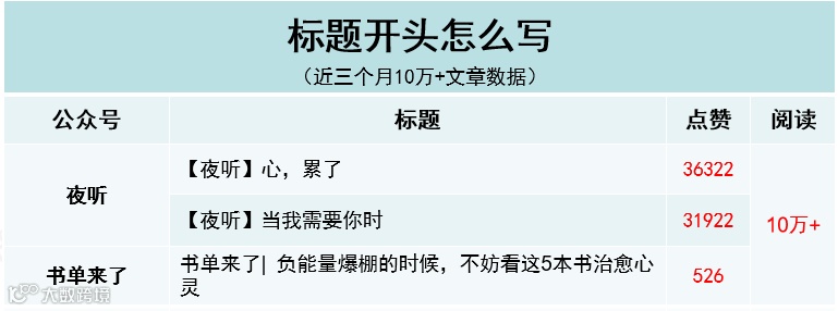 通过在标题开头重复出现自己的公众号名称和品牌词,能够强化粉丝的印象,比如「夜听」。