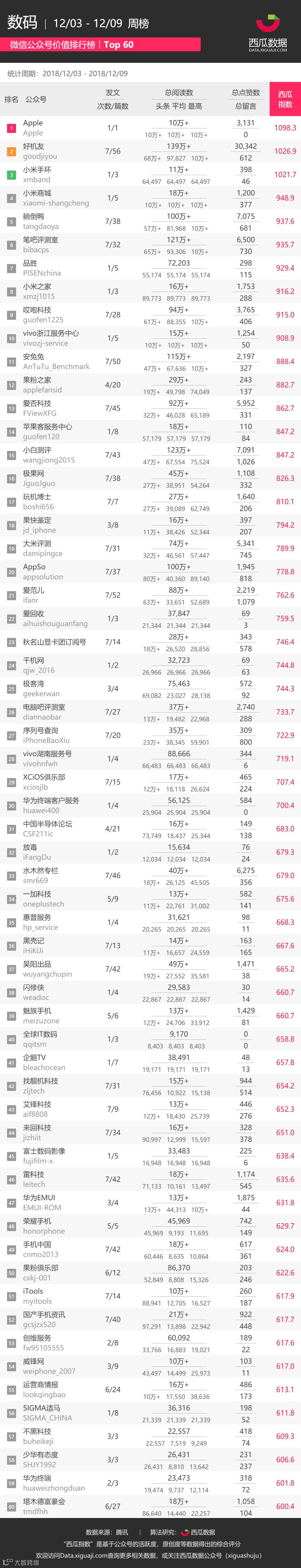本次公众号排行截取「数码-周榜」TOP60。