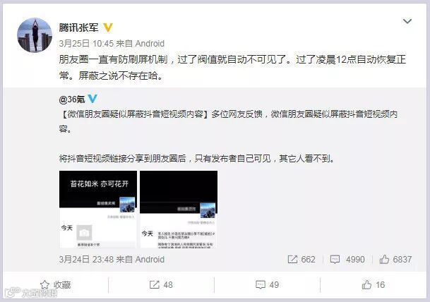 腾讯张军也回应了抖音的限流:微信有防刷屏机制,屏蔽并不存在。