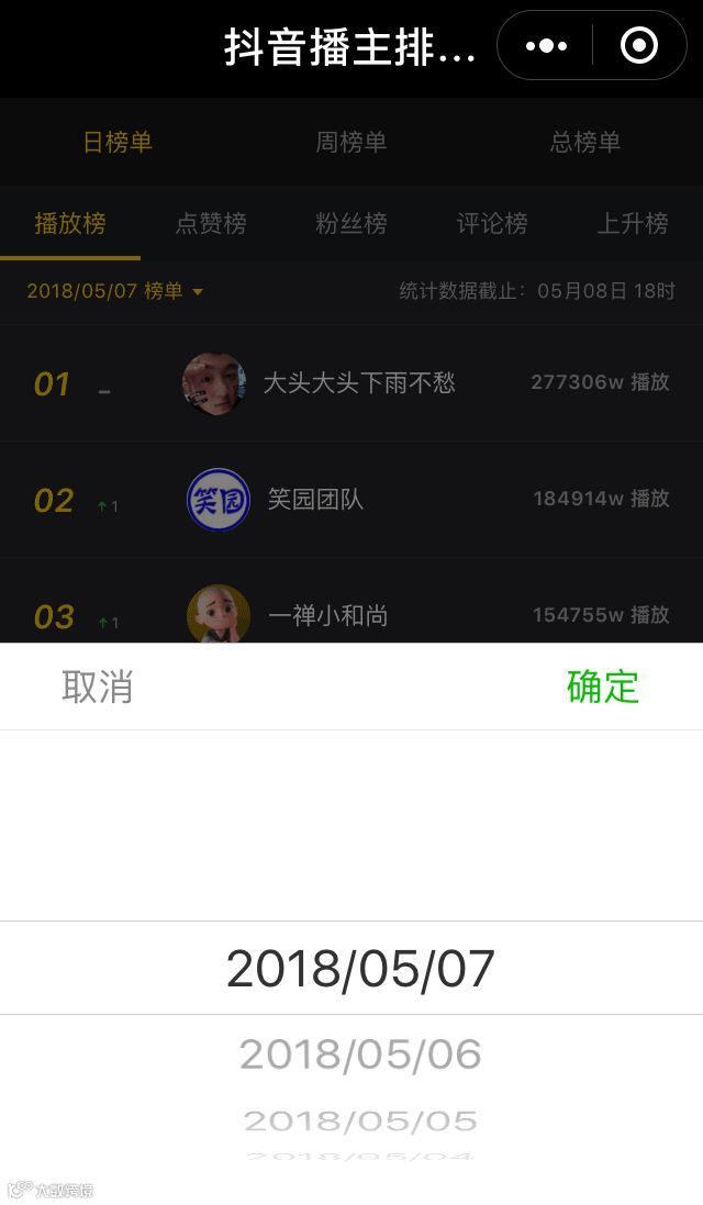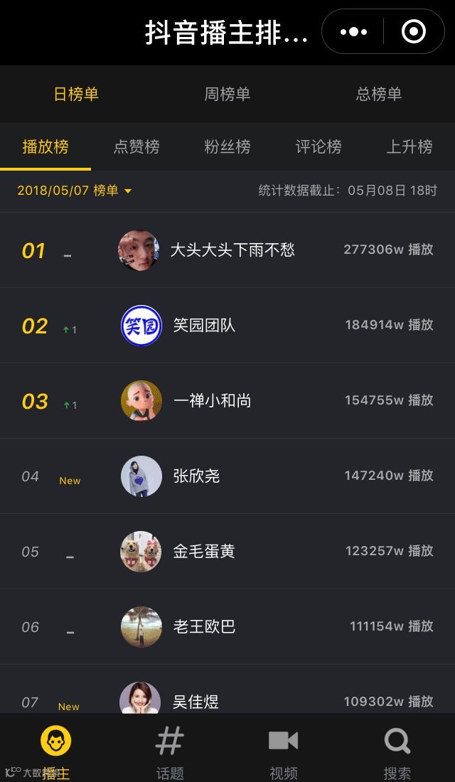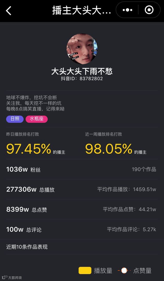 以视频“播放”量为搜索维度,切换日榜单,周榜单和总榜单,都能看到一个名称相当特别的抖音账号“大头大头下雨不愁”,甚至在不少榜单中都能位居榜首!