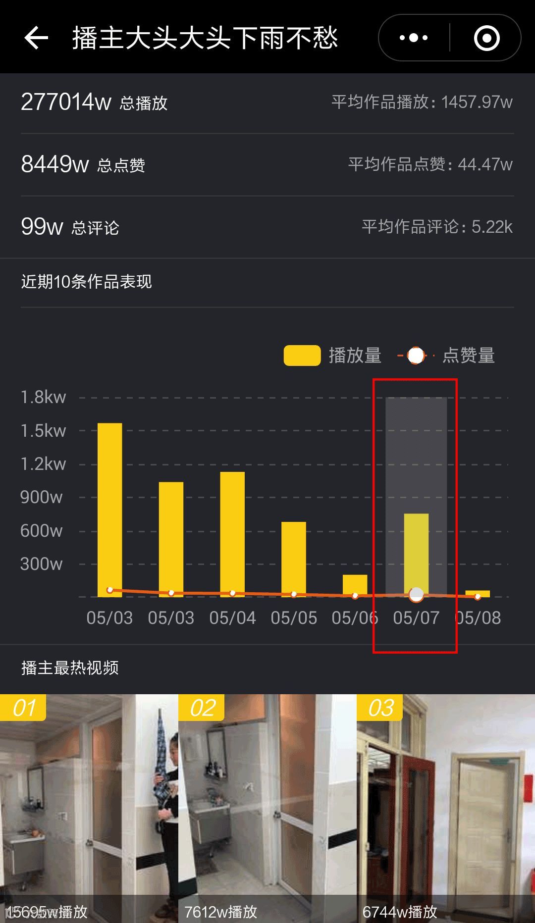 在5月7号西瓜指数的日榜单播放榜中,“大头大头下雨不愁”账号播放量位居第一。