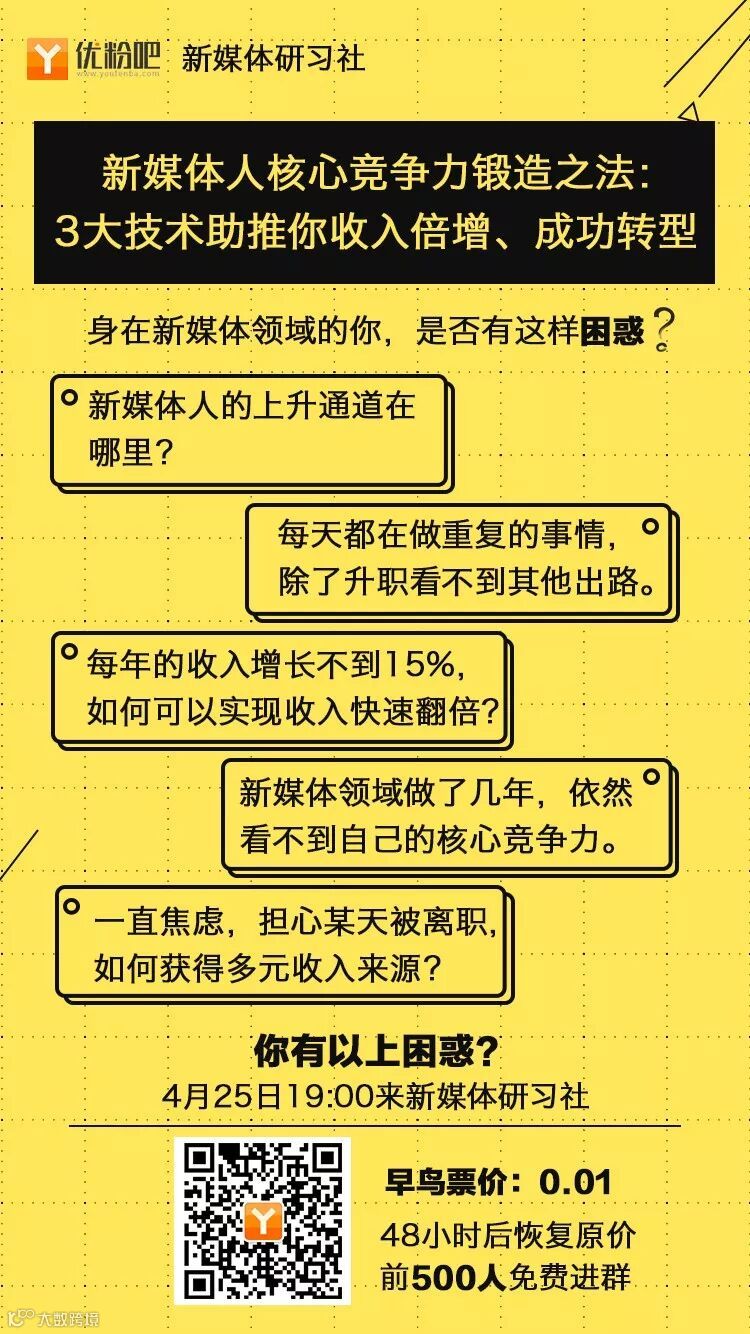 新媒体研习社下周三晚19:00请到一位神秘大咖,想和你们聊聊新媒体人核心竞争力锻造之法!