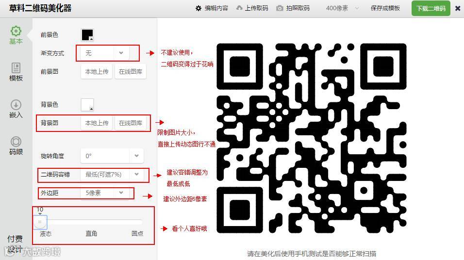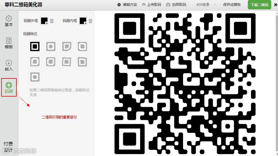 注意,在第二个功能是可以美化二维码的,如果你想让你的平台相对简单,用这些二维码生成网站提供的模板也是不错的。