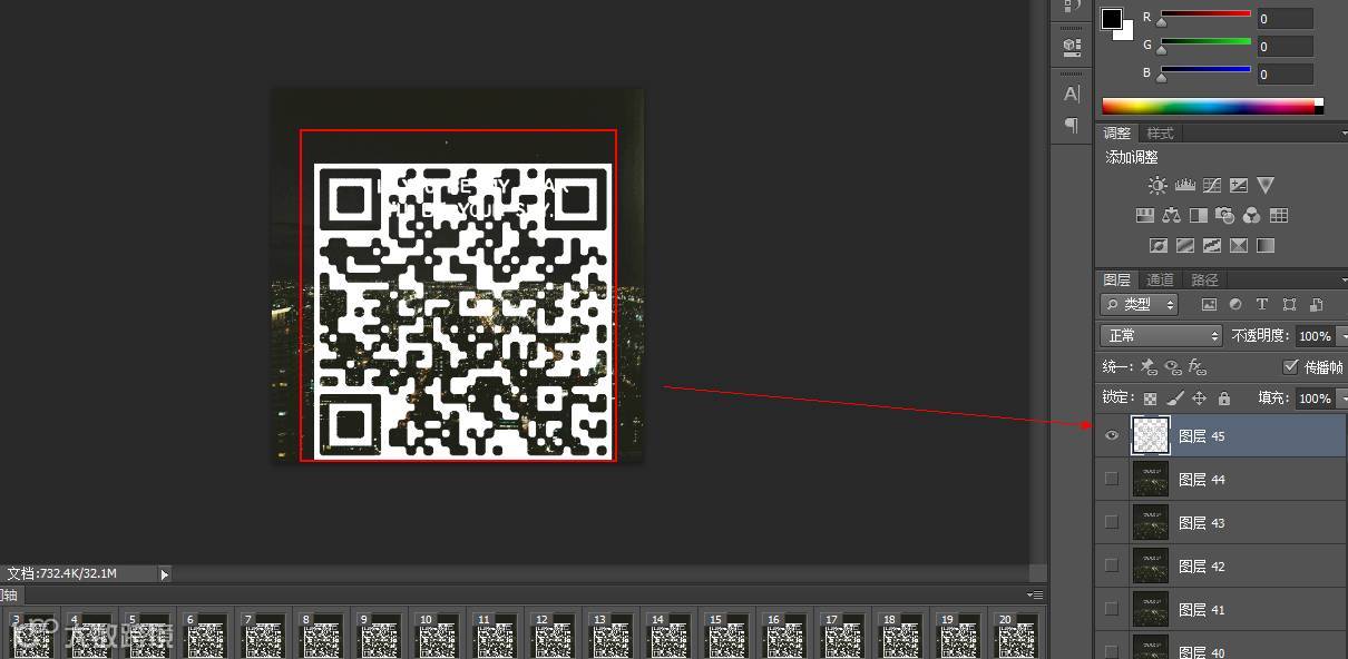 ❻ 打开选好的GIF图,将刚刚做好的二维码图层拖入,并且保持二维码的图层在最上面: