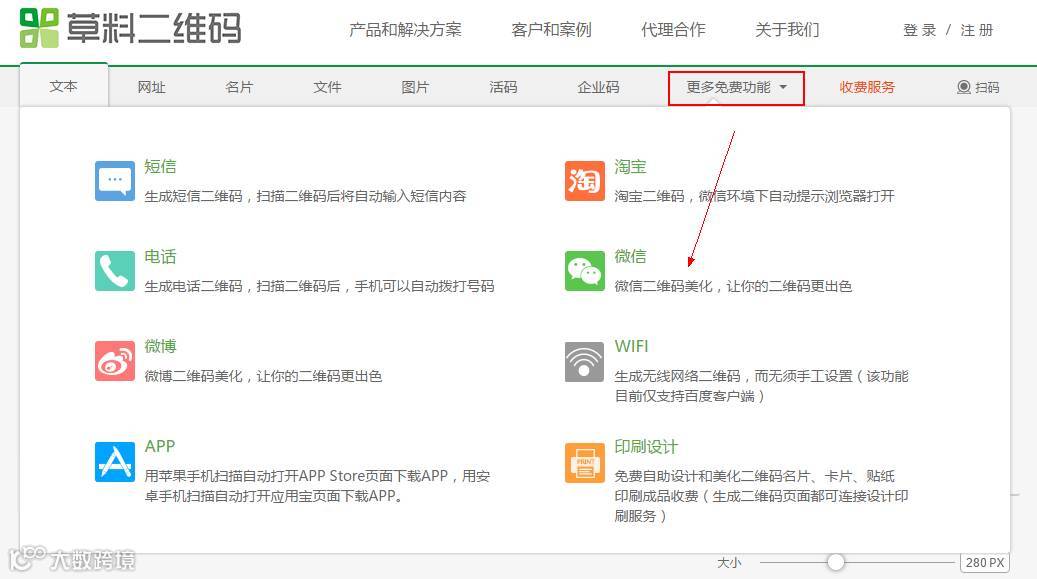 ❶ 进入草料网http://cli.im/后,点击“更多免费功能”,选择“微信”: