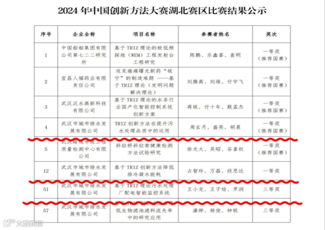 2024年9月6日,武汉控股排水公司参加2024年中国创新方法大赛湖北赛区比赛并获一等奖2项、三等奖2项,武汉控股公司白鹤嘴水厂获二等奖1项。汤逊湖污水处理厂团队成功晋级国赛,取得参加2024年中国创新方法大赛全国总决赛的资格(全省共5个名额),并在全国总决赛荣获二等奖。