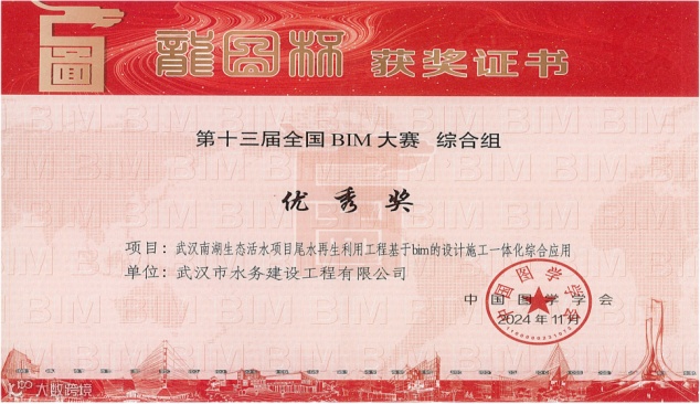 2024年11月,武汉控股工程公司提交的作品《武汉南湖生态活水项目尾水再生利用工程基于BIM的设计施工一体化综合应用》荣获2024年第六届“市政杯”BIM应用技能大赛二类成果和2024年第十三届“龙图杯”全国BIM大赛优秀奖。