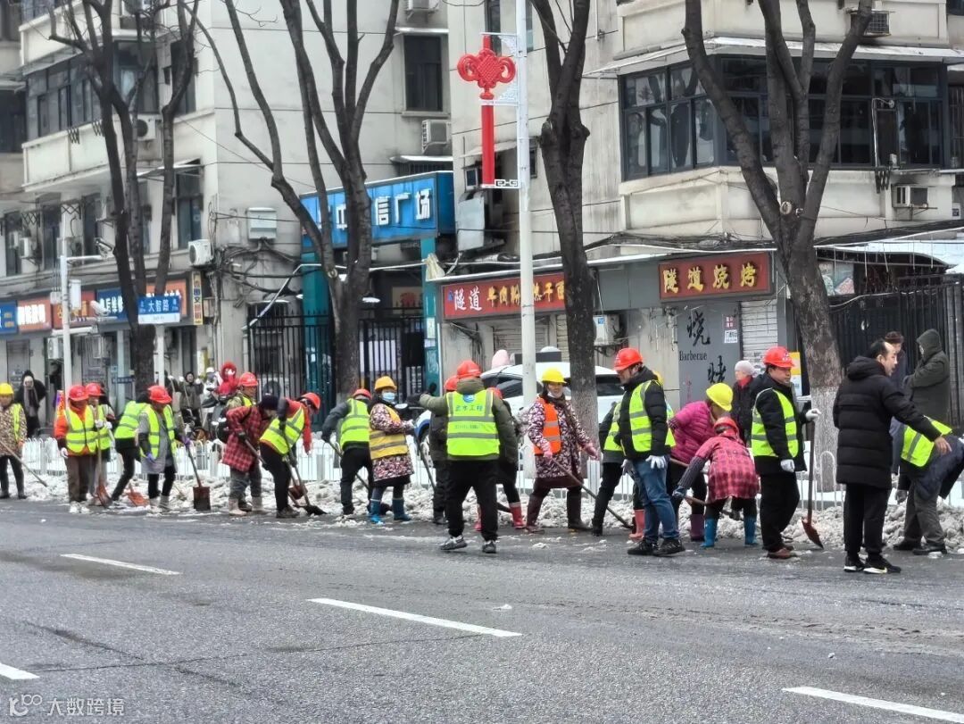 即使寒风刺骨,也抵挡不了武汉控股公司党员职工的热情,他们以南北两路,分头清除主干道、非机动车道、人行道上的冰雪,齐心协力、相互配合,拿着雪锹、铁镐等工具,将坚硬的冰块和积雪一点一点地清除干净,为群众铲出一条条便民暖心路。