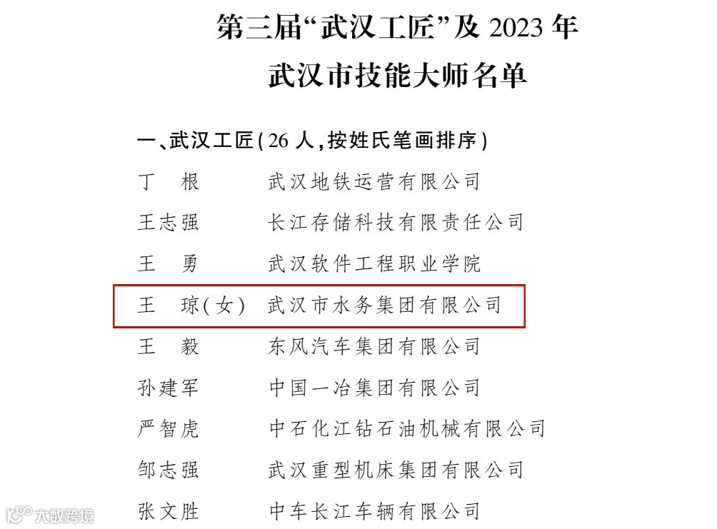 12月27日,武汉市人民政府网发布《市人民政府关于公布第三届武汉工匠及2023年武汉市技能大师名单的通知》,武汉控股公司宗关水厂水质检验高级技师王琼被推选为“武汉工匠”。