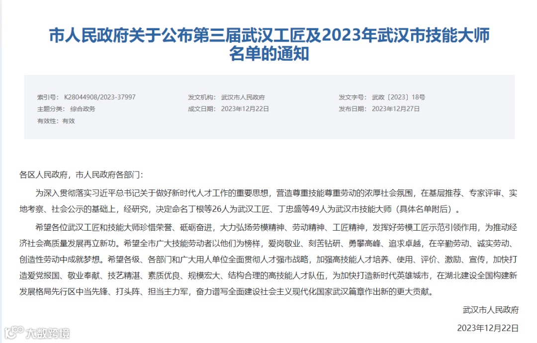 本次公布的“武汉工匠”共有26人、武汉市技能大师共有49人。