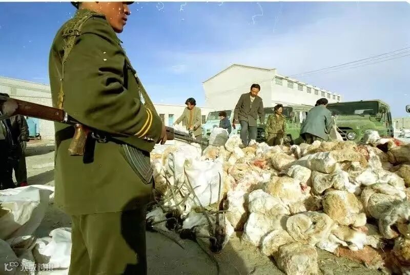 1997年12月,可可西里国家级自然保护区严厉打击盗猎行为,共破获各类盗猎案件107起,集中打击了保护区周边和格尔木等地十分猖獗的藏羚皮非法收购和贩卖活动,斩断了青藏公路偷猎者的运输线。图为警方查获现场。