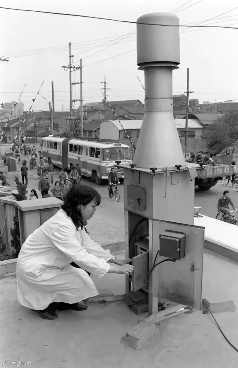 1984年5月4日,我国第一个用电子计算机控制的环境自动监测网在上海建成使用。图为上海市区的一个大气地面自动监测子站,工作人员正在观察大气飘尘自动采样器的数据。