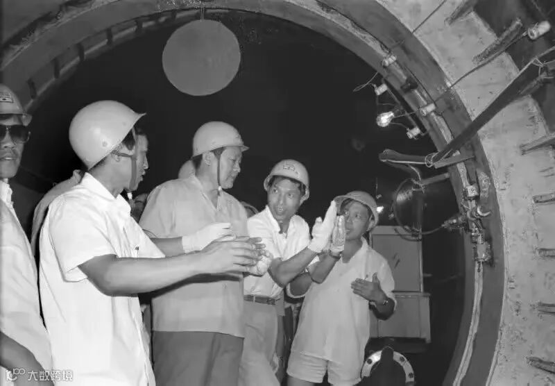 1986年夏季高温期间,时任上海市市委书记芮杏文(左二)前往黄浦江上游引水工程临江泵站工地了解工程进度,并慰问为了使上海人民早日饮到干净的水而流汗大干的建设者们。