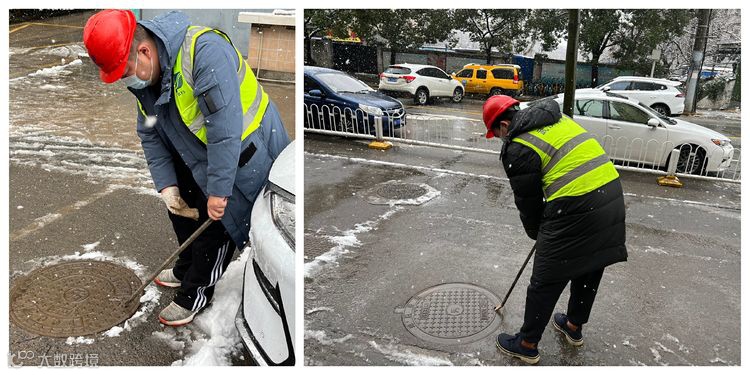 排水公司各单位对厂区内主要道路、职工行走路线等重要地点的积雪进行清理,对积雪较多的区域铺洒工业盐加速积雪融化,并在楼梯台阶处铺盖草垫,确保车辆和职工出行安全。