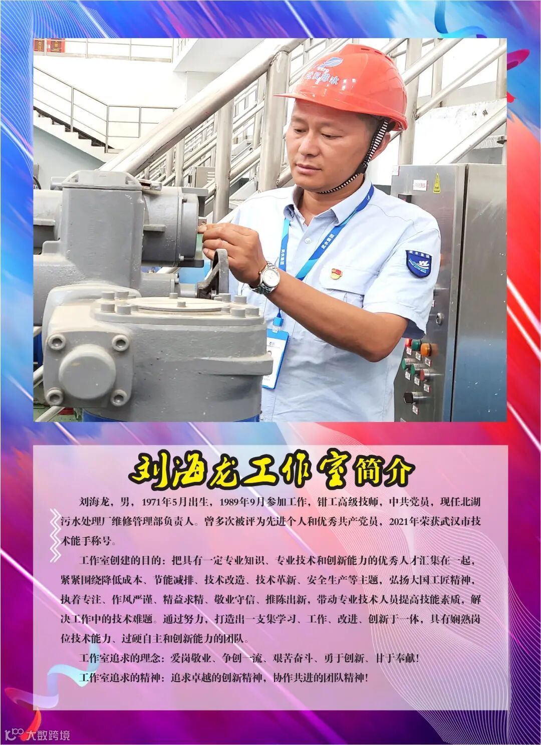 刘海龙,男,50岁,中共党员,北湖污水处理厂维修管理部部长,钳工高级技师,从事维修工作三十二年,始终以一名共产党员的标准严格要求自己,不断提高思想政治水平和专业素质能力。