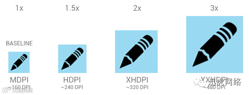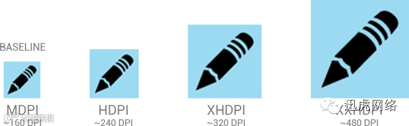 在Android应用中,以MDPI为基准界面尺寸,恰好对应上面提及的iphone应用的基准界面尺寸(320×480),所需的切图图标为iphone中对应的1倍图;XHDPI则对应2倍图,HDPI和XXHDPI可依此类推。